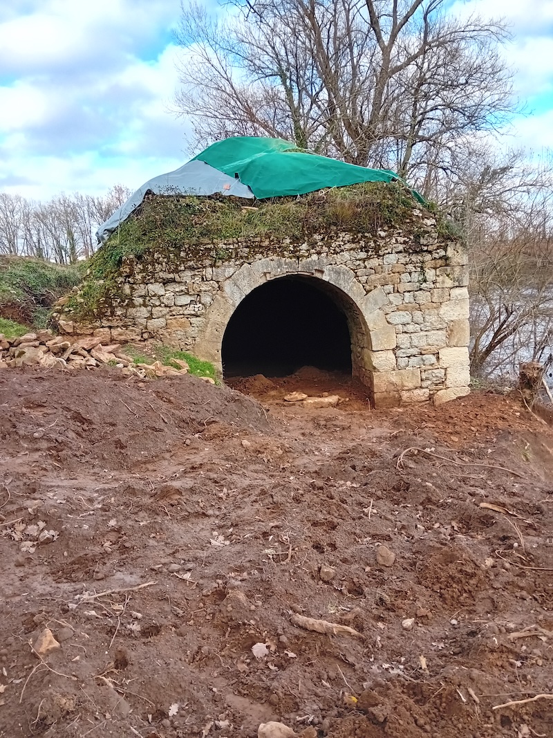 Cette année, le CHVP a financé le travail de deux professionnels : sous la férule d’une architecte, un terrassier a décapé une partie du sol face à la voute, ainsi qu’une purge partielle de l’intérieur. Cette opération a mis au jour l’emplacement de l’axe du mécanisme d’enroulement qui était au cœur du cabestan. Par ailleurs un seuil de pierre est apparu ainsi qu’une canalisation et un petit bassin taillés dans le socle rocheux de la berge. Il est probable que de nouvelles découvertes apporteraient des éclairages sur cet ancien dispositif et d’en comprendre le fonctionnement. Vous trouverez ci-joint un fichier, fourni par l’architecte, illustrant les travaux réalisés.