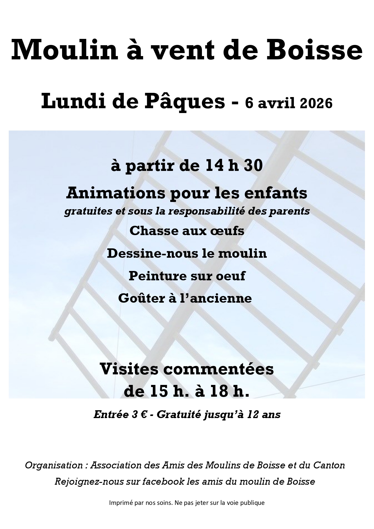 Malgré le passage de la tempête Nils qui a brisé des ailes du moulin de Boisse, l’AMBC accueillera, selon la tradition, enfants et visiteurs le lundi de Pâques après- midi. Pour la troisième fois en 30 ans, depuis la création de l’association, les ailes du moulin ont été endommagées par un vent trop violent. Chaque fois la commune et l’association se sont unies pour lui rendre ses ailes ; nul doute qu’à nouveau il en sera de même. Il n’est pas étonnant que la majorité des 120 moulins à vent recensés dans le sud du Lot en 1809 aient disparu : ces sinistres répétés sont le signe de leur fragilité. C’est un devoir pour l’histoire des techniques et de la vie dans nos campagnes de sauvegarder ceux qui restent.