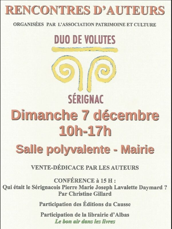 Cette manifestation, organisée pour la 2e fois par l’association Duo de volute et soutenue par la municipalité accueillera une quinzaine d’auteurs, un éditeur et une libraire. A noter la conférence sur Joseph Daymard (1873-1939), infatigable promoteur du tourisme lotois, dont le nom est associé à de nombreuses publications encore aujourd’hui consultées.